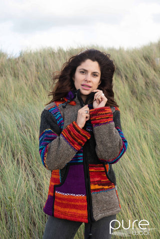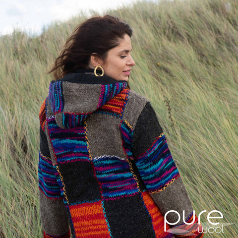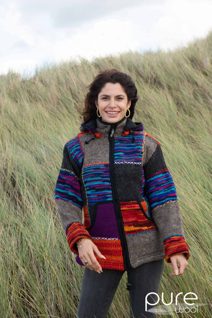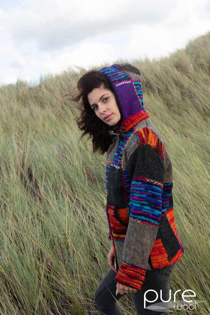 Deze hand gebreide jas is gemaakt van 100% puur Nieuw-Zeelands wol met een dikke, zachte fleece voering. De jas heeft een capuchon, zakken met fleece voering en een extra binnenzak.