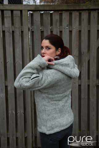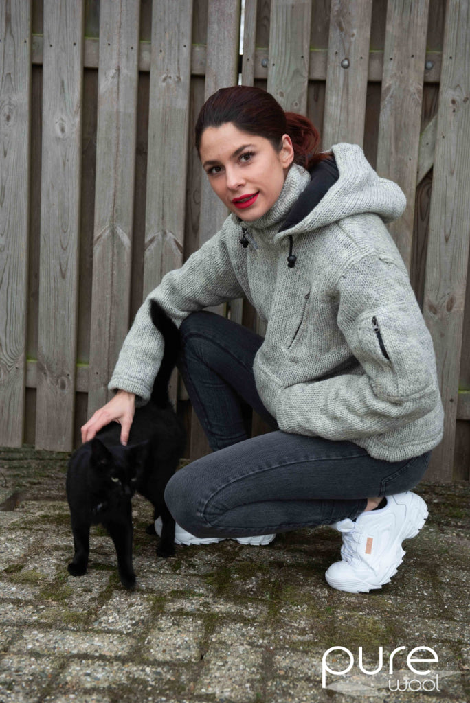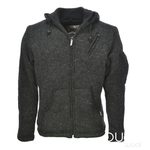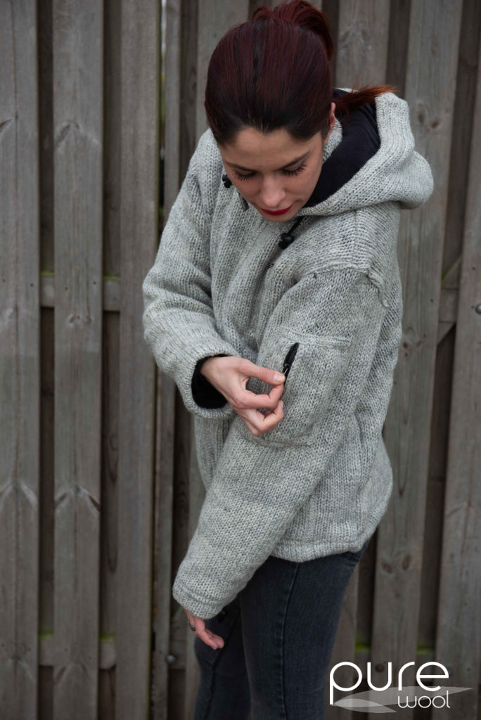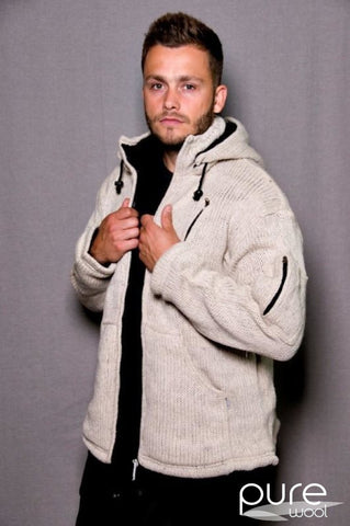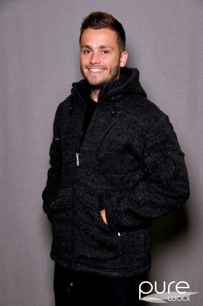 Deze hand gebreide jas is gemaakt van 100% puur Nieuw-Zeelands wol met een dikke, zachte fleece voering. De jas heeft een capuchon, zakken met fleece voering en een extra binnenzak.